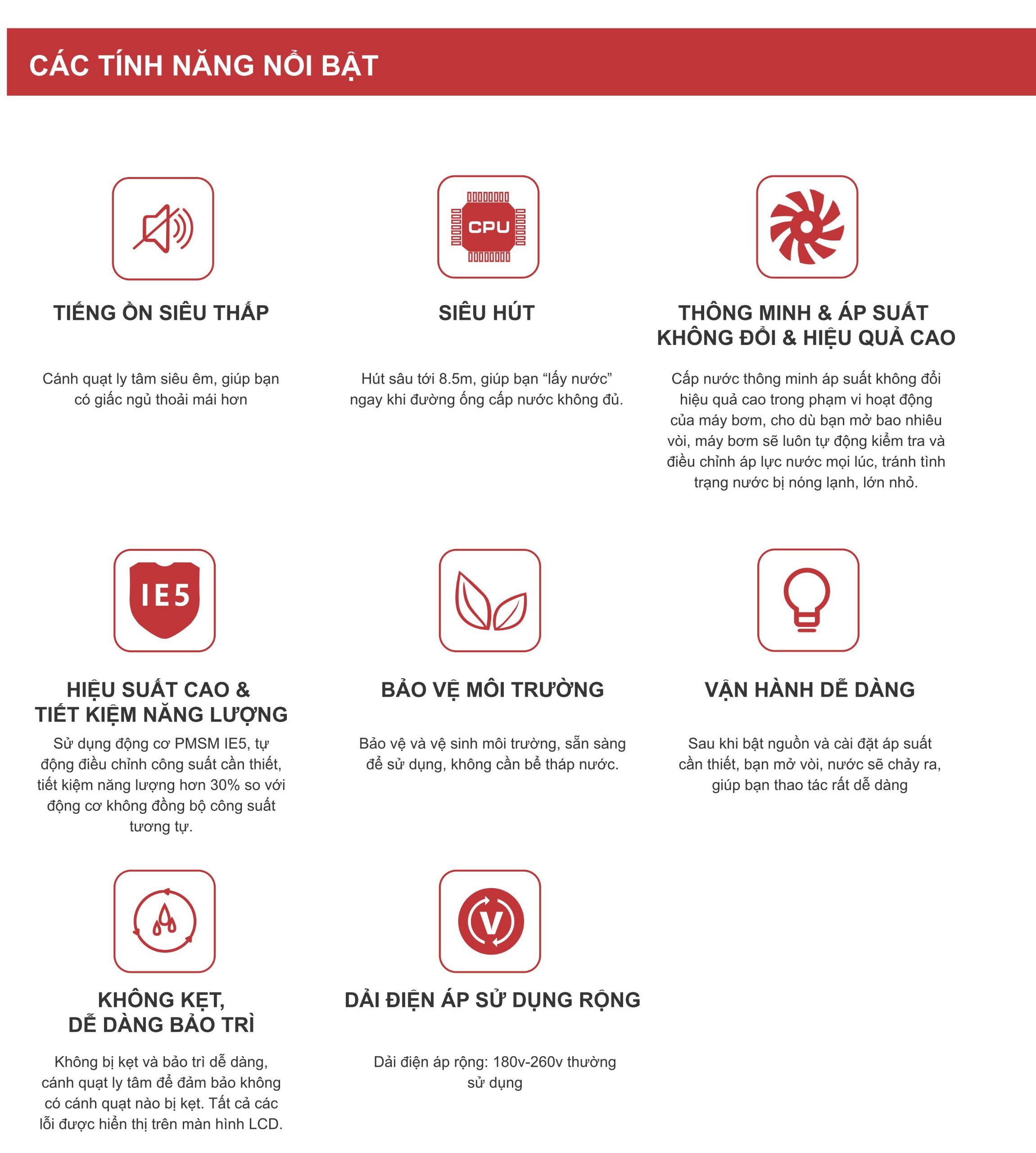 - Khi bơm hoạt động độ rung, độ ồn rất thấp giúp tăng tuổi thọ bơm.
